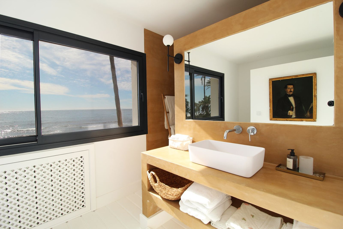 Villa d'exception située en bord de mer dans le prestigieux domaine privé de Casasola, à Guadalmina Baja. Récemment rénovée et exposée plein sud, cette propriété offre une vue panoramique imprenable sur la Méditerranée, avec l'Afrique et Gibraltar à l'horizon. La maison, d'un style à la fois contemporain et typiquement ibicenco, s'étend sur un terrain de 2 300 m². Son agencement fonctionnel s'articule autour de deux cours centrales, baignant ainsi la maison de lumière naturelle. Le séjour se divise en deux espaces distincts, avec un coin salon cosy doté d'une cheminée attenant à la pièce principale. Ce dernier mène à la salle à manger pouvant accueillir confortablement au moins 10 convives. Le séjour et la salle à manger donnent tous deux accès à une immense terrasse couverte, qui s'ouvre sur un vaste jardin et une piscine. La superbe cuisine en L, agencée avec soin, est équipée d'appareils Siemens. Une buanderie séparée se trouve également à proximité. Le rez-de-chaussée comprend six suites, dont deux avec accès direct au jardin et à la piscine. Deux chambres de service sont situées à l'arrière de la propriété. L'étage supérieur comprend la suite parentale, deux salles de bains, de nombreux rangements et un solarium offrant une vue imprenable sur le rivage et le bruit des vagues. La résidence est sécurisée 24h/24 et se situe à quelques minutes en voiture de San Pedro et de Puerto Banús.