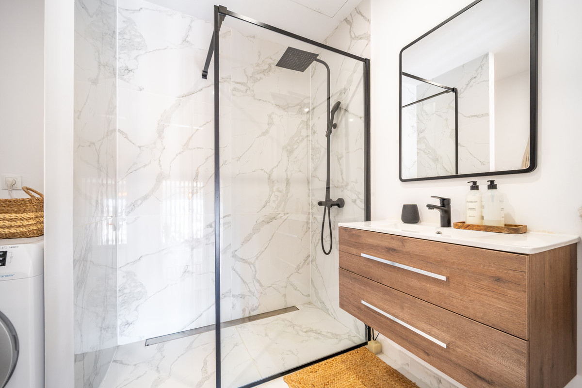 Ce penthouse comprend trois chambres spacieuses et deux salles de bains modernes, récemment rénovées dans un style contemporain élégant. Les intérieurs, ornés de parquet et de portes vitrées, accentuent la sensation d'espace et de luminosité. Entièrement meublé avec des prestations haut de gamme, il offre également la possibilité d'ajouter du mobilier sur mesure selon les préférences de chacun. Une terrasse privative et des espaces extérieurs, couverts et découverts, permettent de profiter pleinement du climat méditerranéen.