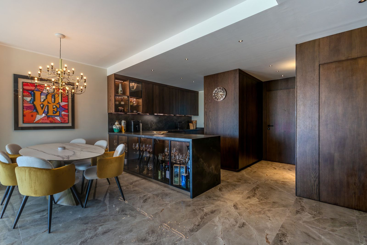 Le vaste séjour s'ouvre sur une généreuse terrasse couverte, dont une partie a été vitrée pour créer un espace de vie agrandi, idéal pour profiter toute l'année des vues imprenables sur les montagnes, la mer et le port de Fuengirola.