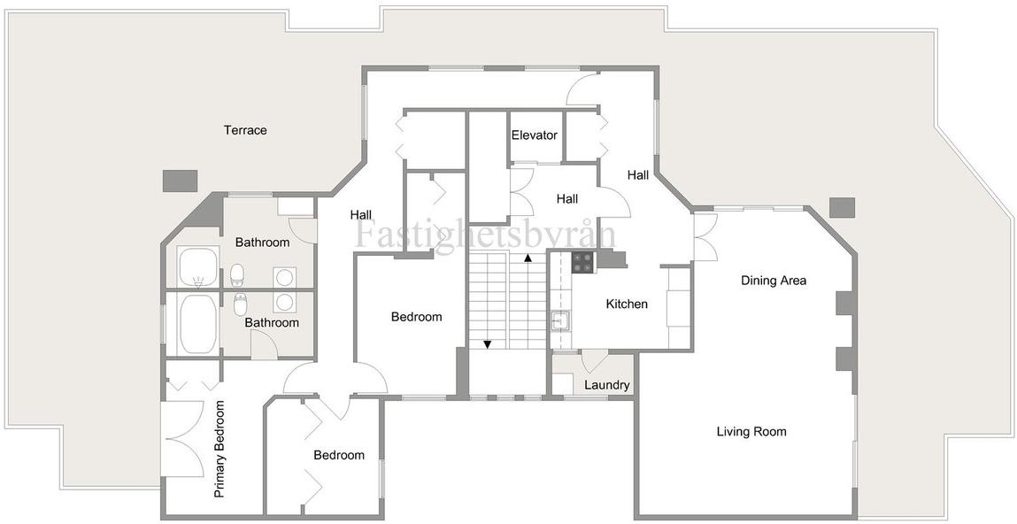 The living areas consist of a bright lounge and dining space with multiple access points to the expansive terrace of approximately 165 sqm, which wraps around the entire property and creates a wonderful sense of space and natural light from multiple orientations. Open views are enjoyed in all directions, providing a unique opportunity to experience the surroundings throughout the day. The exceptional size of the terrace offers a wide range of possibilities — from generous lounge areas and an outdoor kitchen to versatile spaces rarely found in this type of property.