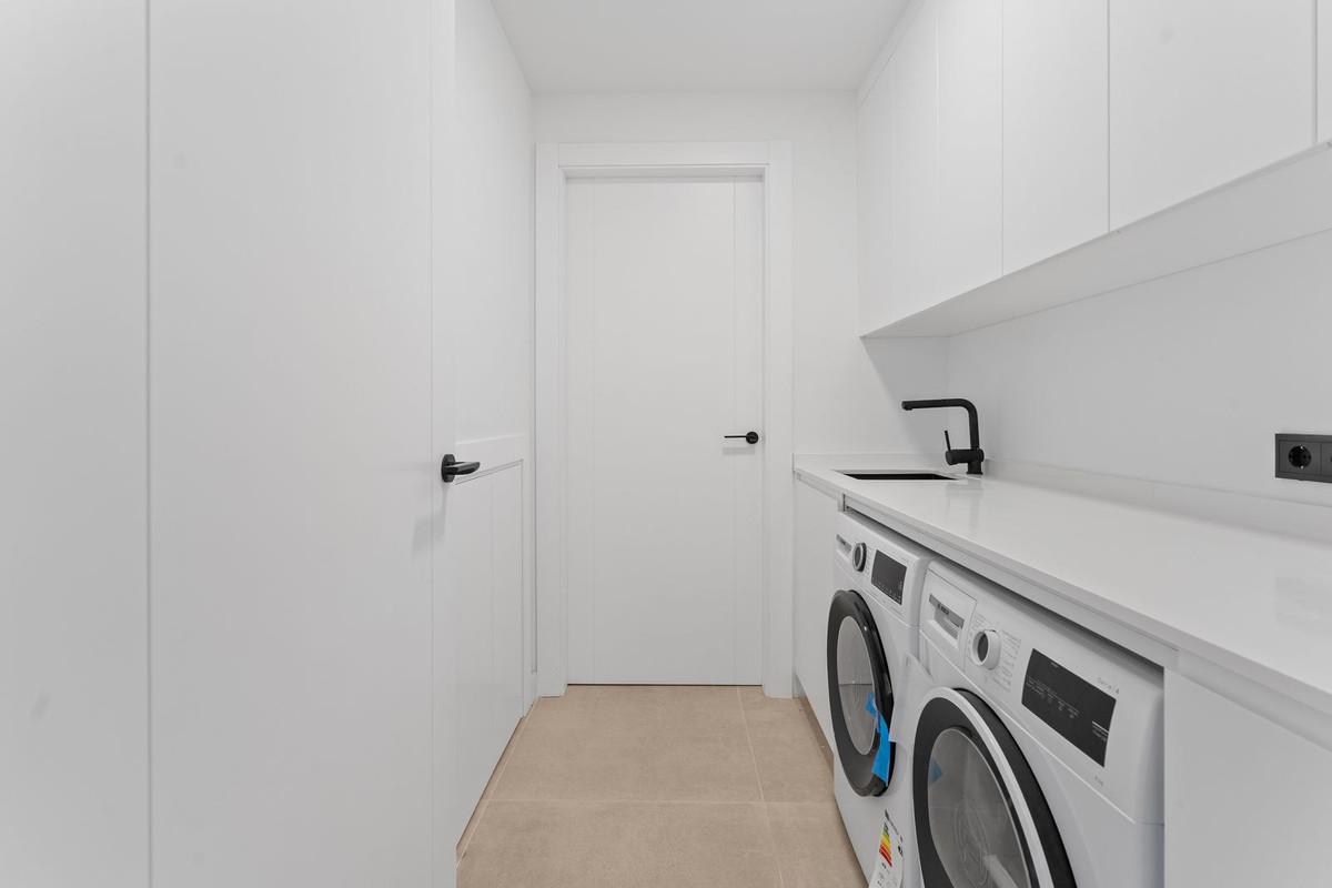Chaque élément de la construction a été choisi avec un souci constant de qualité, de durabilité et d'esthétique. La cuisine est équipée de meubles Porcelanosa, assortie à un carrelage en porcelaine au sol et aux murs de la même marque prestigieuse, créant ainsi une finition harmonieuse et élégante dans toute la propriété. Les fenêtres en aluminium Strugal intègrent la technologie de rupture de pont thermique, un double vitrage de sécurité, un contrôle solaire et un vitrage à faible émissivité, garantissant une excellente isolation, une efficacité énergétique optimale et une sécurité renforcée.