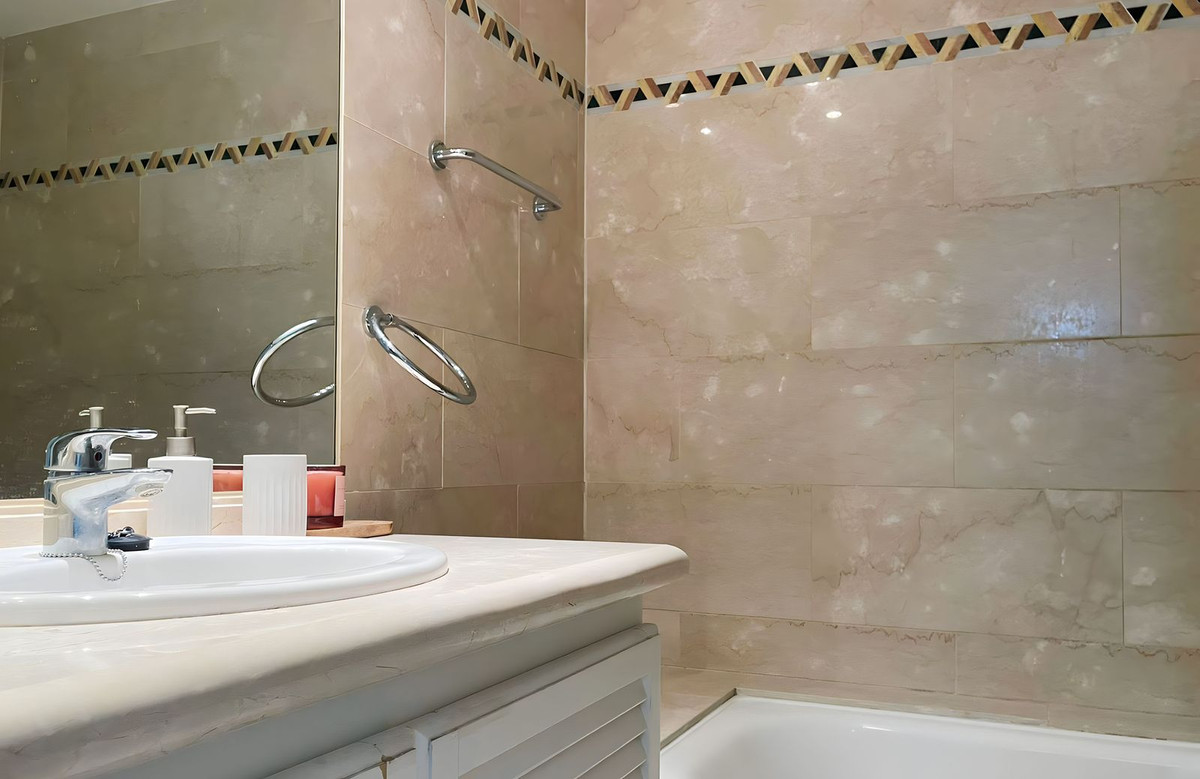 L'appartement dispose d'une cuisine séparée, spacieuse et entièrement équipée, qui s'intègre harmonieusement au vaste séjour. Le séjour et la chambre principale donnent tous deux accès à une magnifique terrasse, idéale pour profiter du climat méditerranéen et des vues panoramiques. L'orientation sud-est garantit une luminosité exceptionnelle et offre une vue imprenable sur le majestueux mont La Concha et la mer sereine.